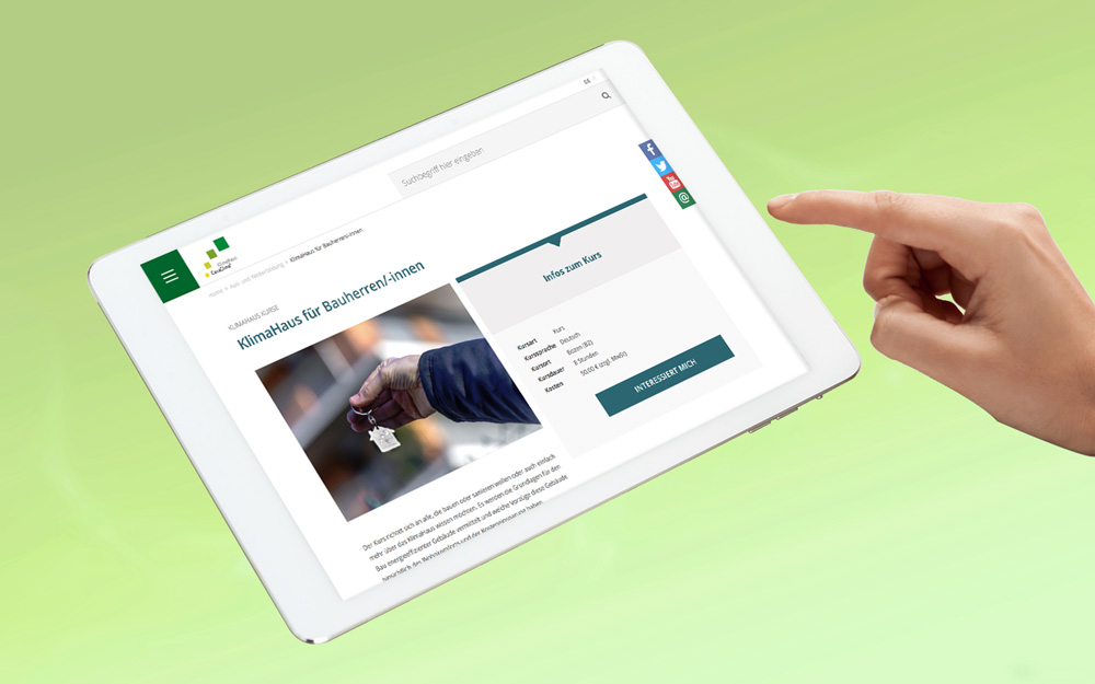 Der User kann sich, entweder durch den Kurskalender oder die Kursübersicht über das Angebot der KlimaHaus Agentur informieren, die Details des jeweiligen Kurses (Kosten, Location, Kursbeschreibung, Dozenten, Rezensionen,…) einsehen und diese nach Zielgruppe oder Thema (Tagging) filtern. Kurse und Inhalte werden über das CMS eingepflegt. Die Anmeldung erfolgt über ein Online-Formular mit der Möglichkeit benötigte Dateien (wie z.B. CV, Bestätigung der Teilnahme an Vorgängerkurs,…) über die Webseite hochzuladen und am Anmeldeformular anzuhängen.