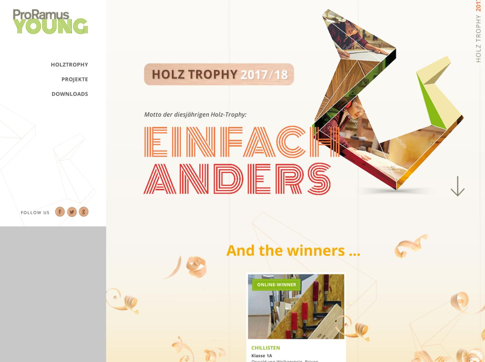 Die Holztrophy ist ein Wettbewerb für Südtiroler Mittelschulen, welcher im Rahmen des dort stattfindenden Technikunterrichtes ausgeführt wird. Während des gesamten Schuljahres wird ein Projekt zum jeweiligen Jahresthema in Holz ausgearbeitet. Das Motto zum Projektstart 2017/2018 lautet „Entspannen nach der Schule“. Die Schüler*innen realisieren in Zusammenarbeit mit Südtiroler Tischlereien ihren Vorschlag, erleben hautnah die verschiedenen Projektphasen und können ihrer Kreativität freien Lauf lassen. Außerdem erhalten sie einen ersten Einblick in die Welt des Handwerks und dessen zahlreiche Berufsmöglichkeiten.