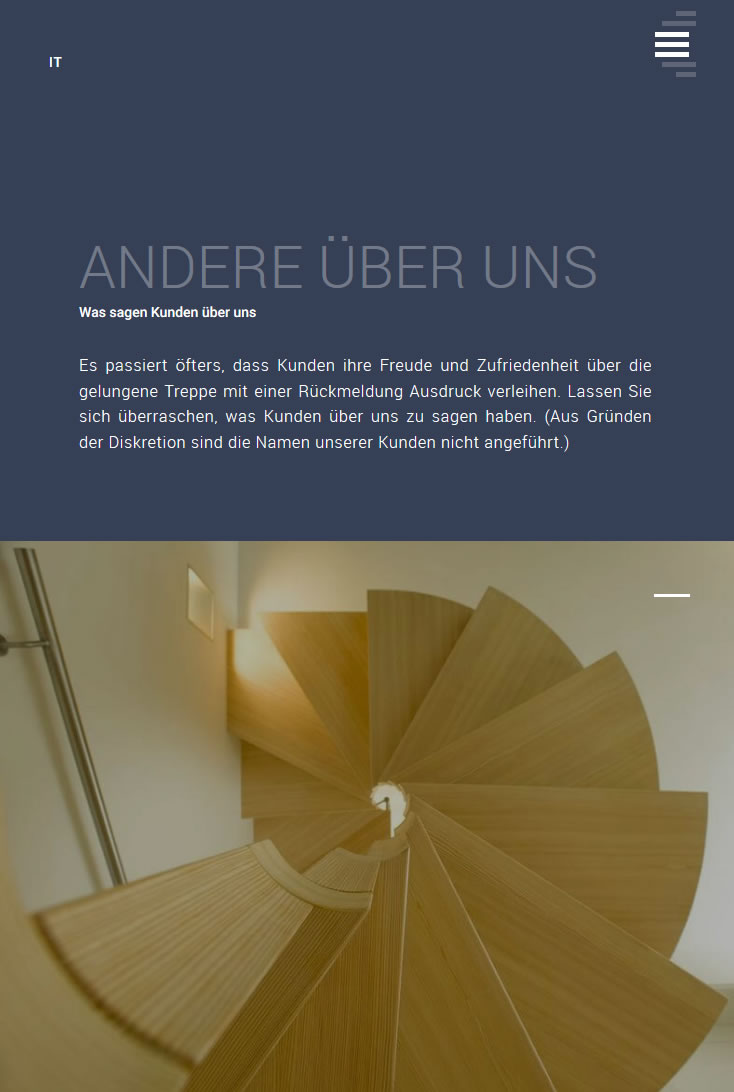 Im Hauptmenü selbst wird das Menü mit dem Wortspiel „Wir machen Treppen auf Maß überall und das gut. Fragen Sie uns“ dargestellt. Dabei hat Teil des Satzes seine Bedeutung und einen dazu passenden Inhalt.